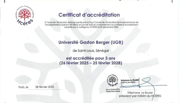 L’Université Gaston Berger (UGB) de Saint-Louis vient d’obtenir une accréditation internationale. Ce qui est un événement marquant pour l’institution. Cette accréditation a été délivrée par le Haut Conseil de l’évaluation de la recherche et de l’enseignement supérieur (HCÉRES). Et elle est valable pour une période de trois ans, du 26 février 2025 au 25 février 2028.